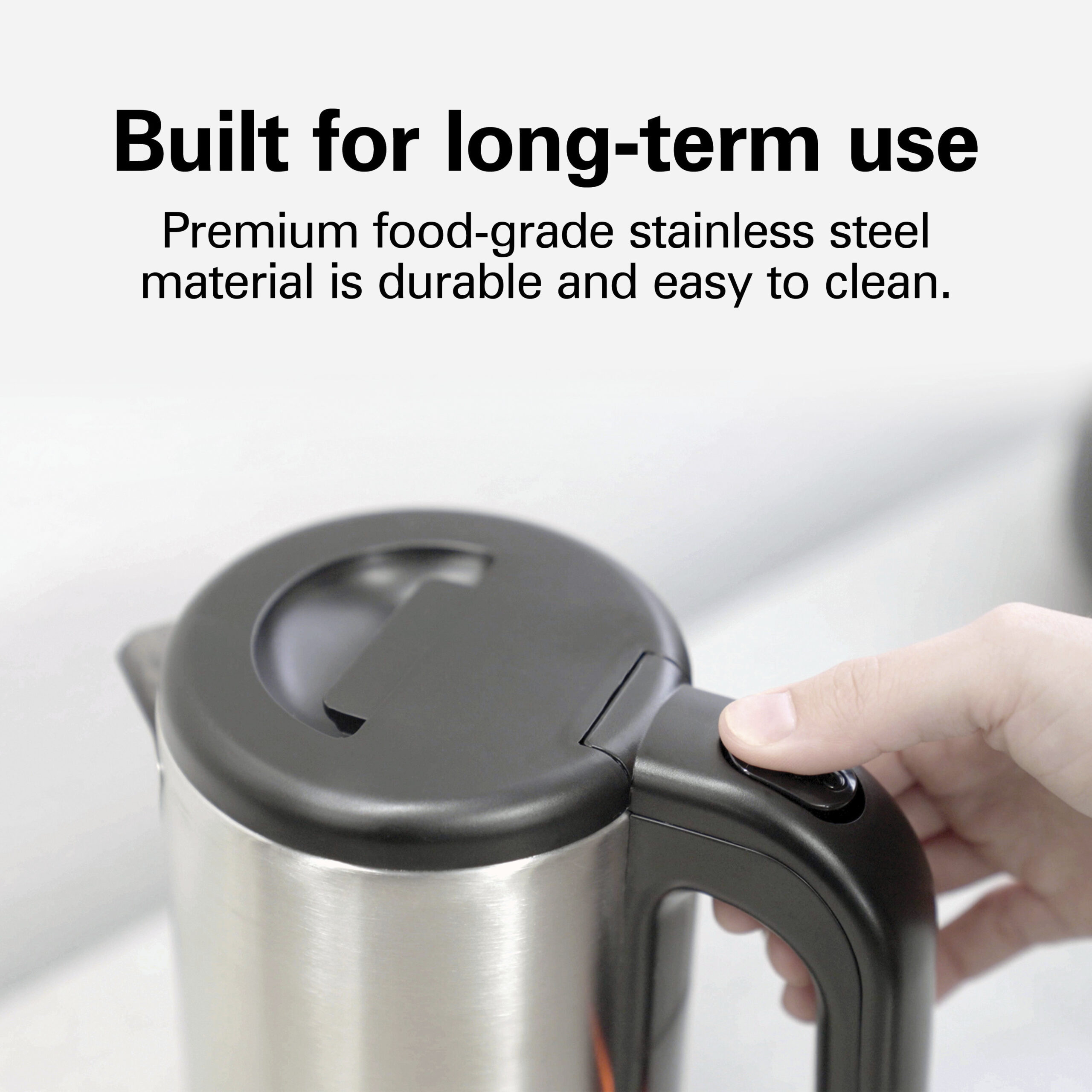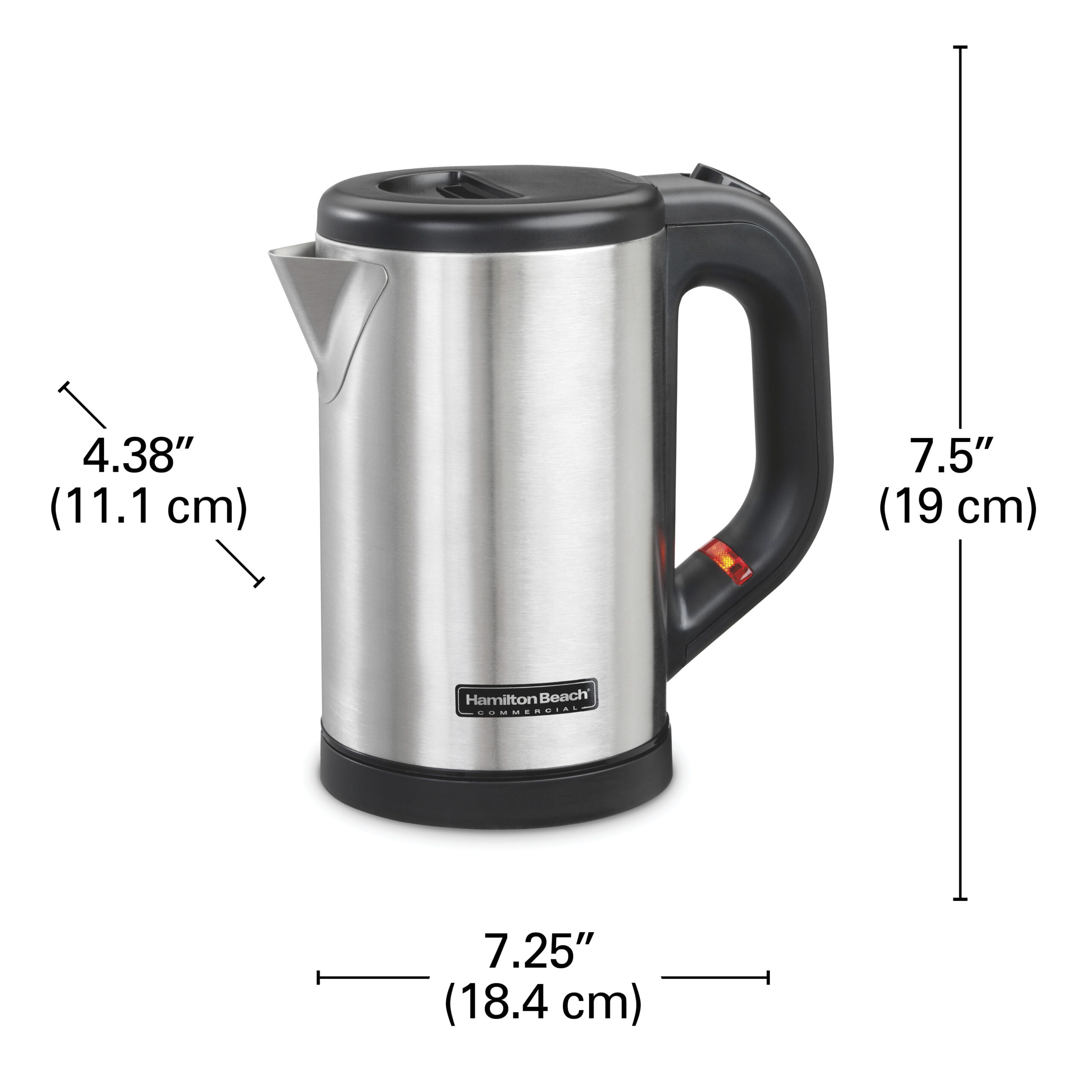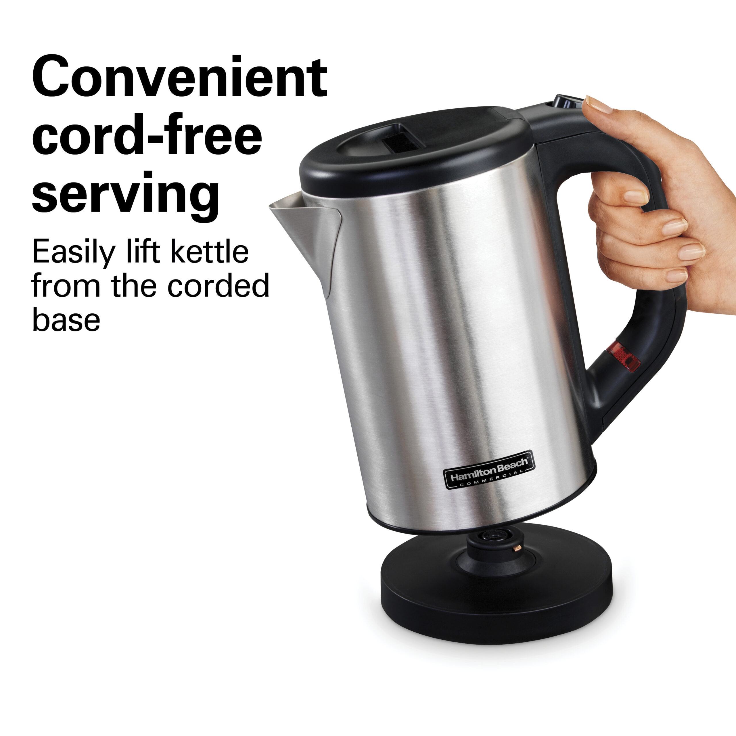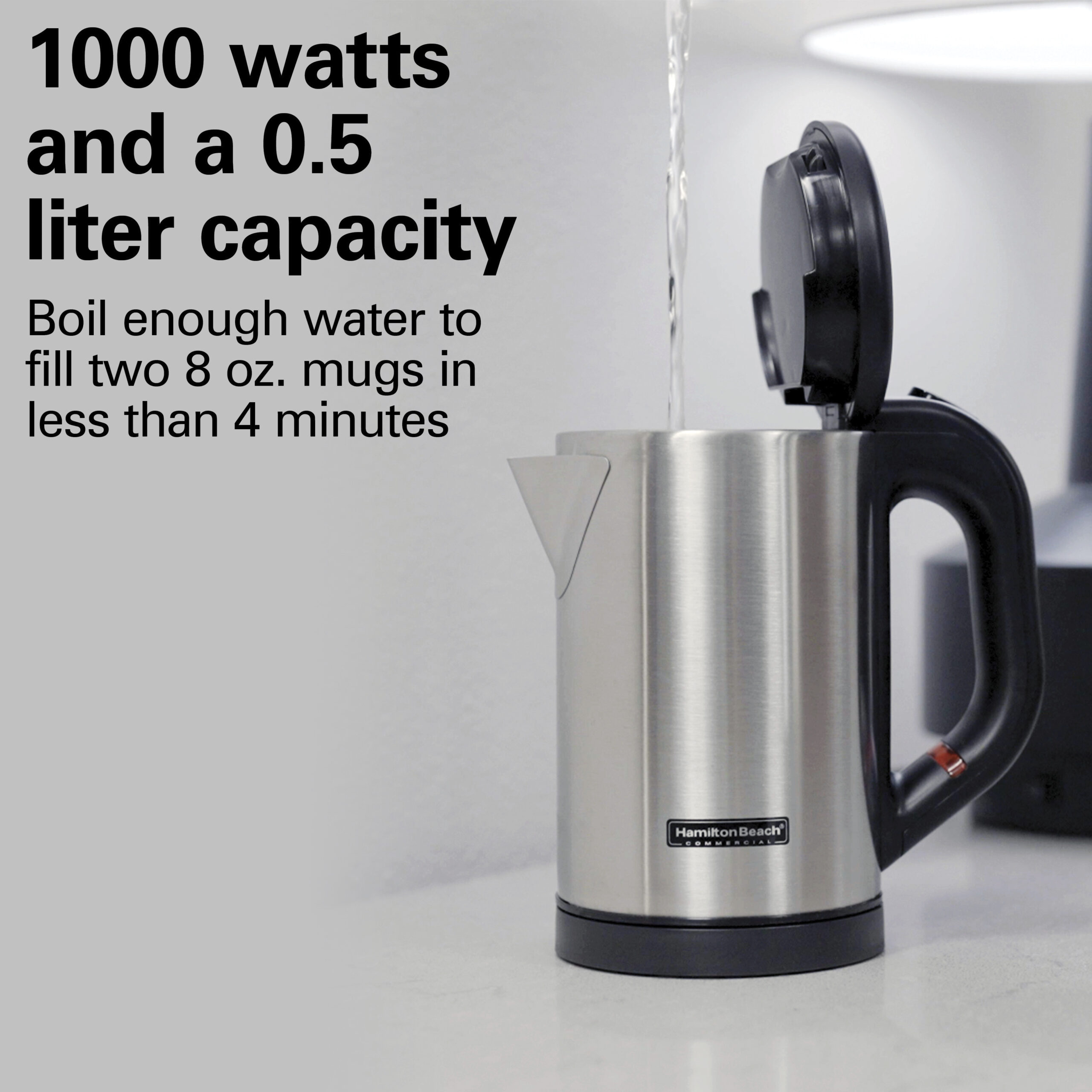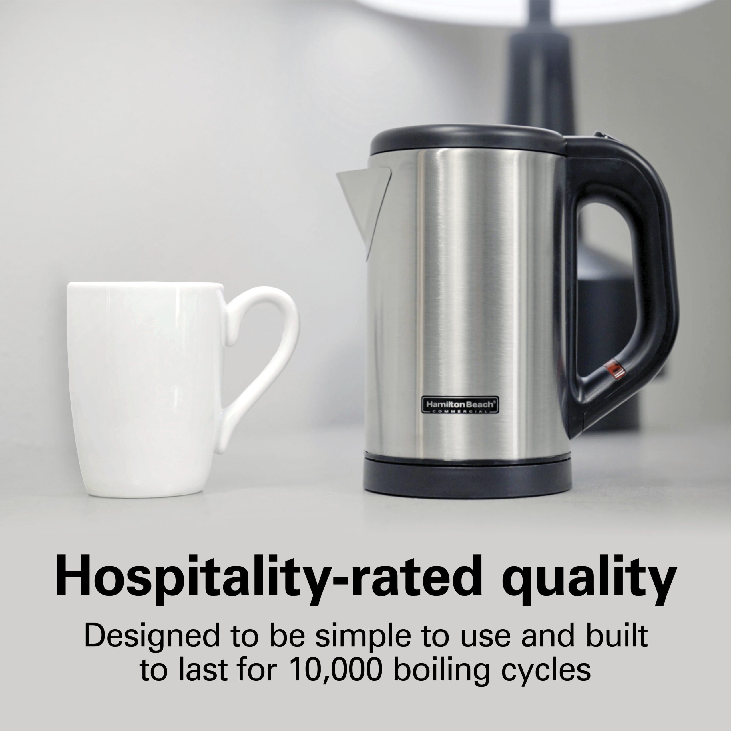 Hotel guests want to save time in the morning. The Hamilton Beach Commercial® Hospitality 0.5 Liter Stainless Steel Kettle is easy to use and even easier to maintain. This kettle is suitable for in-room use or at a breakfast bar, giving guests the opportunity to heat water for tea, cocoa, oatmeal or even instant coffee. Cord-free serving is convenient, and the 3-foot power cord wraps around the base for tangle-free storage.