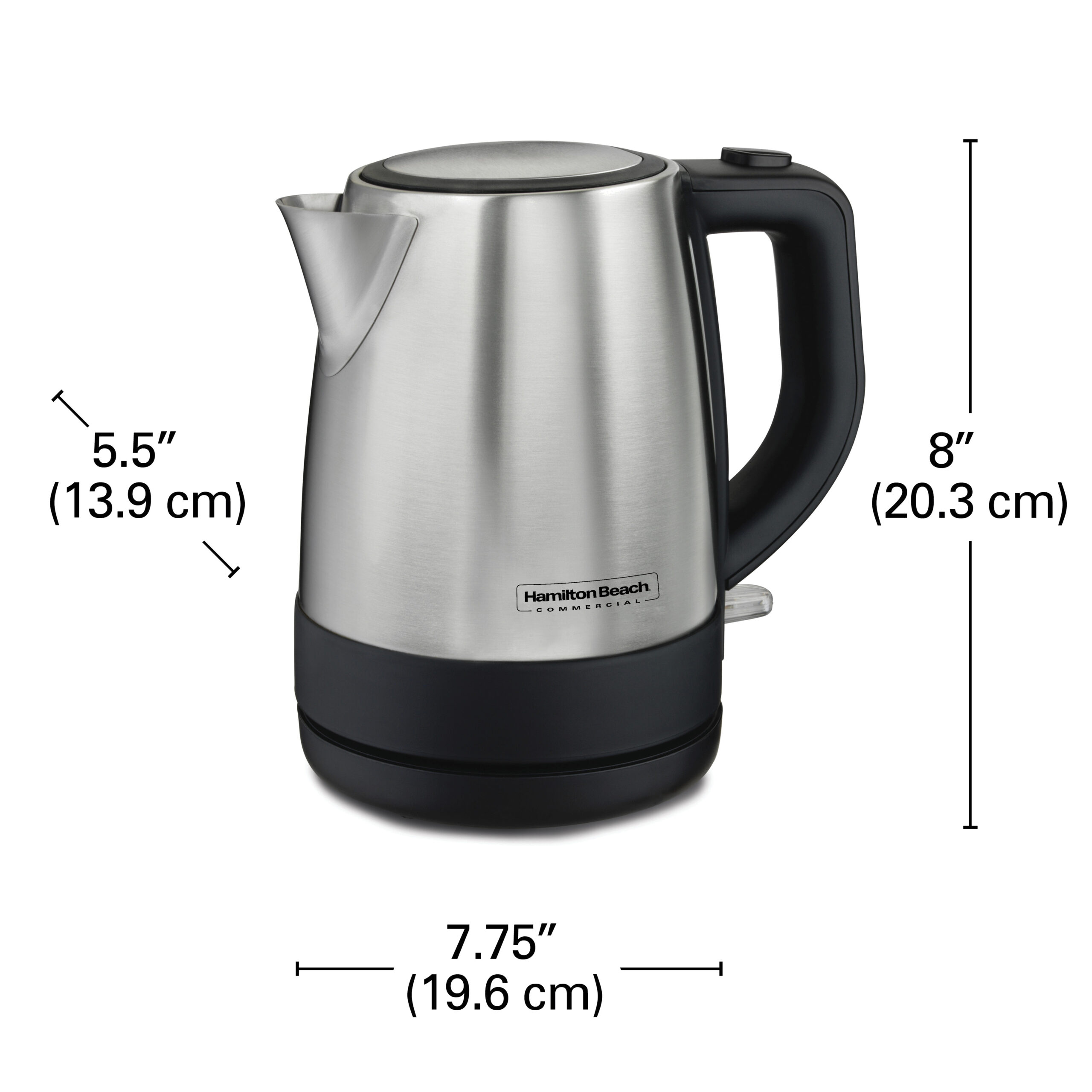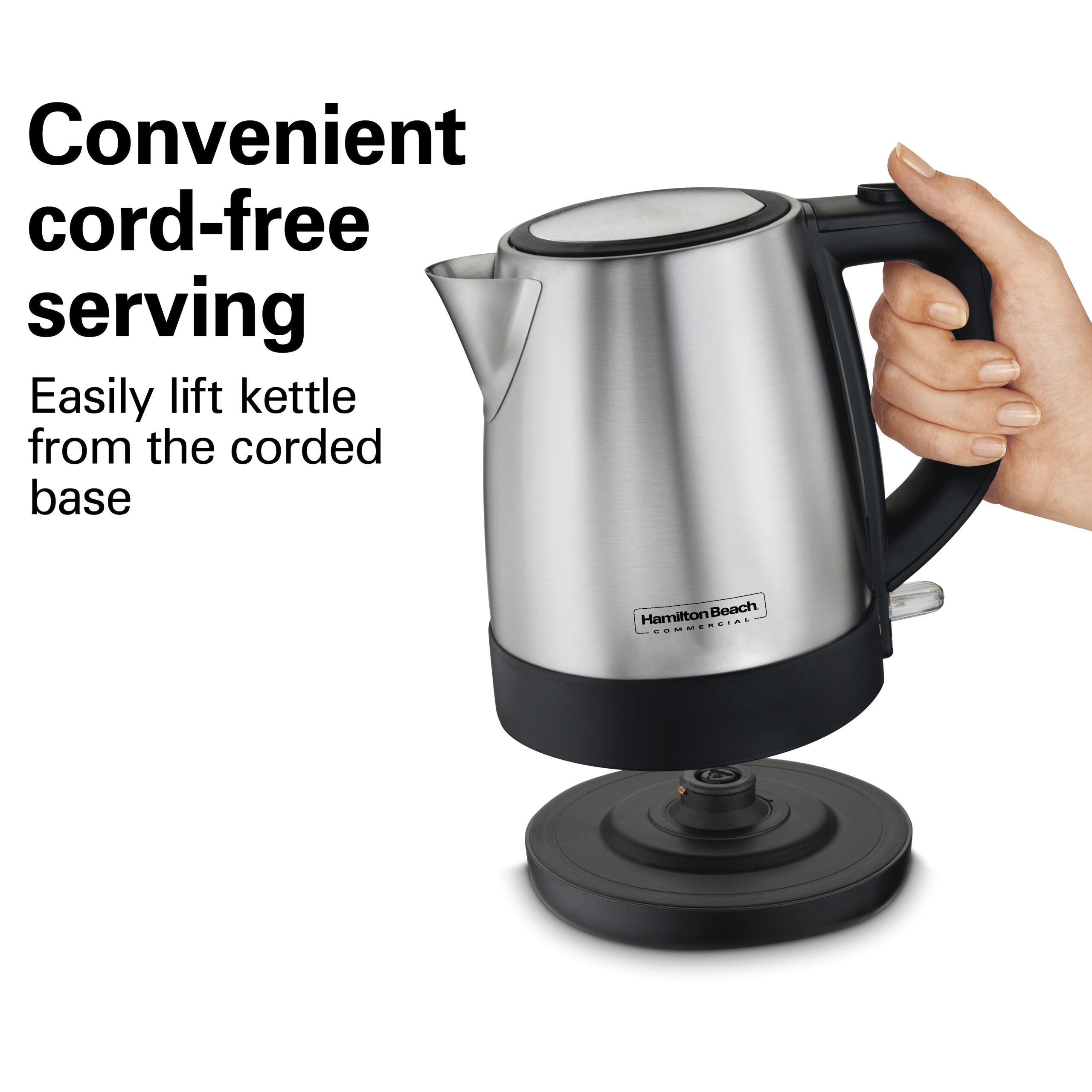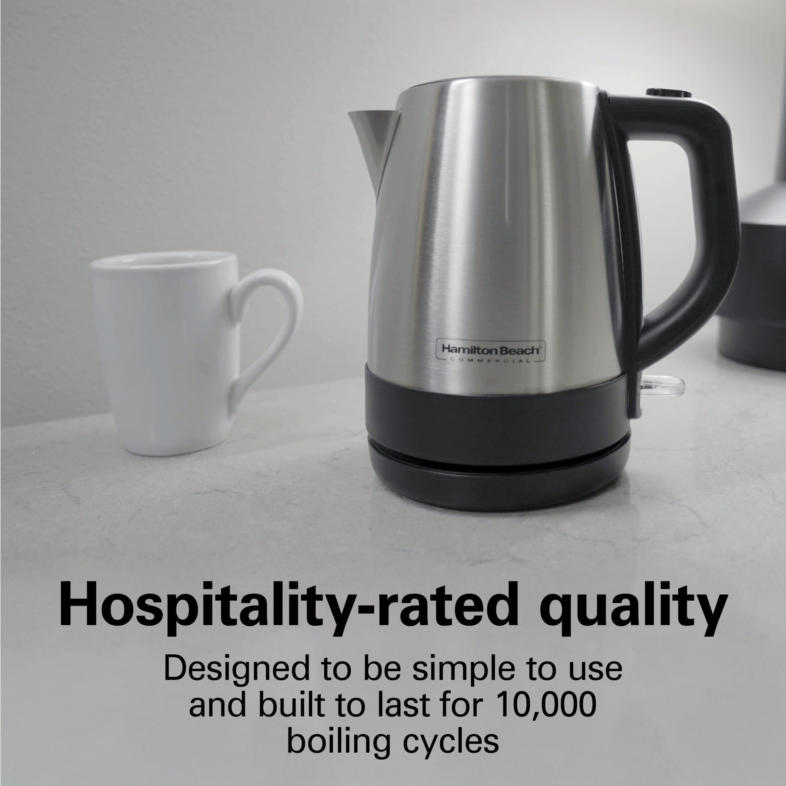 This kettle is suitable for in-room use or at a breakfast bar, giving guests the opportunity to heat water for tea, cocoa, oatmeal or even instant coffee. Hotel guests want to save time in the morning, having a hot water kettle available for them is an appreciated convenience. The Hamilton Beach Commercial® 1 Liter Stainless Steel Kettle is hospitality rated, easy to use and even easier to maintain. Cord-free serving is convenient, and the 3-foot power cord wraps around the base for tangle-free storage.