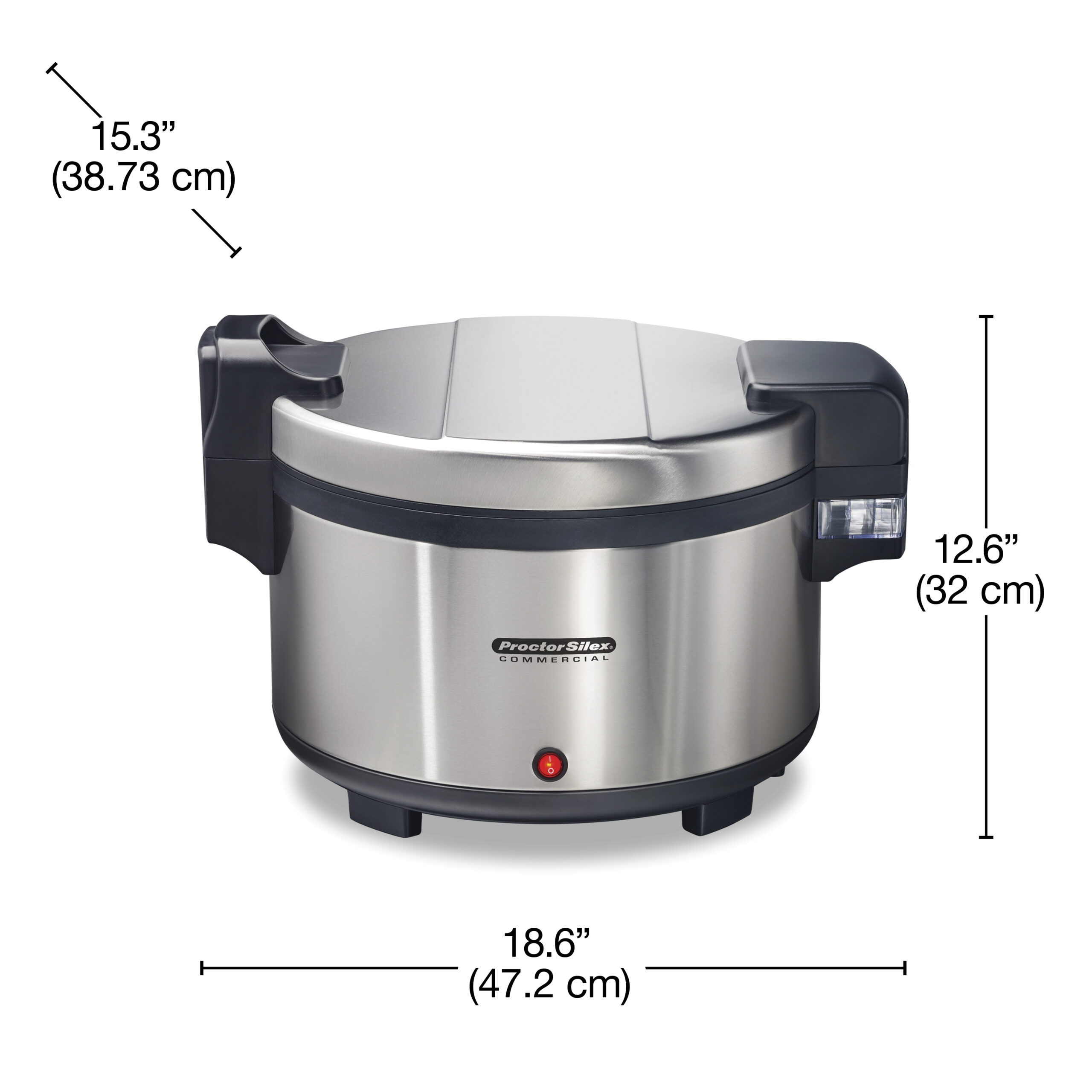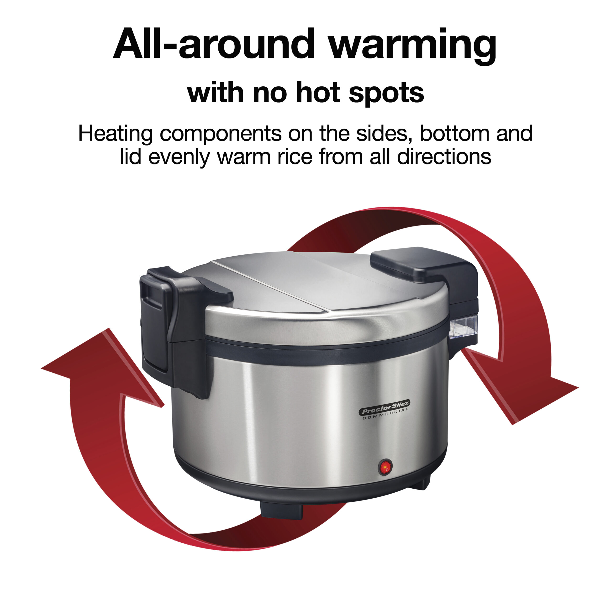The durable Proctor Silex® Commercial Rice Warmer is built to last through constant rigorous use. The insulated double-wall stainless steel construction with a hinged, heated lid holds various types of rice at food safe temperatures for up to 12 hours.