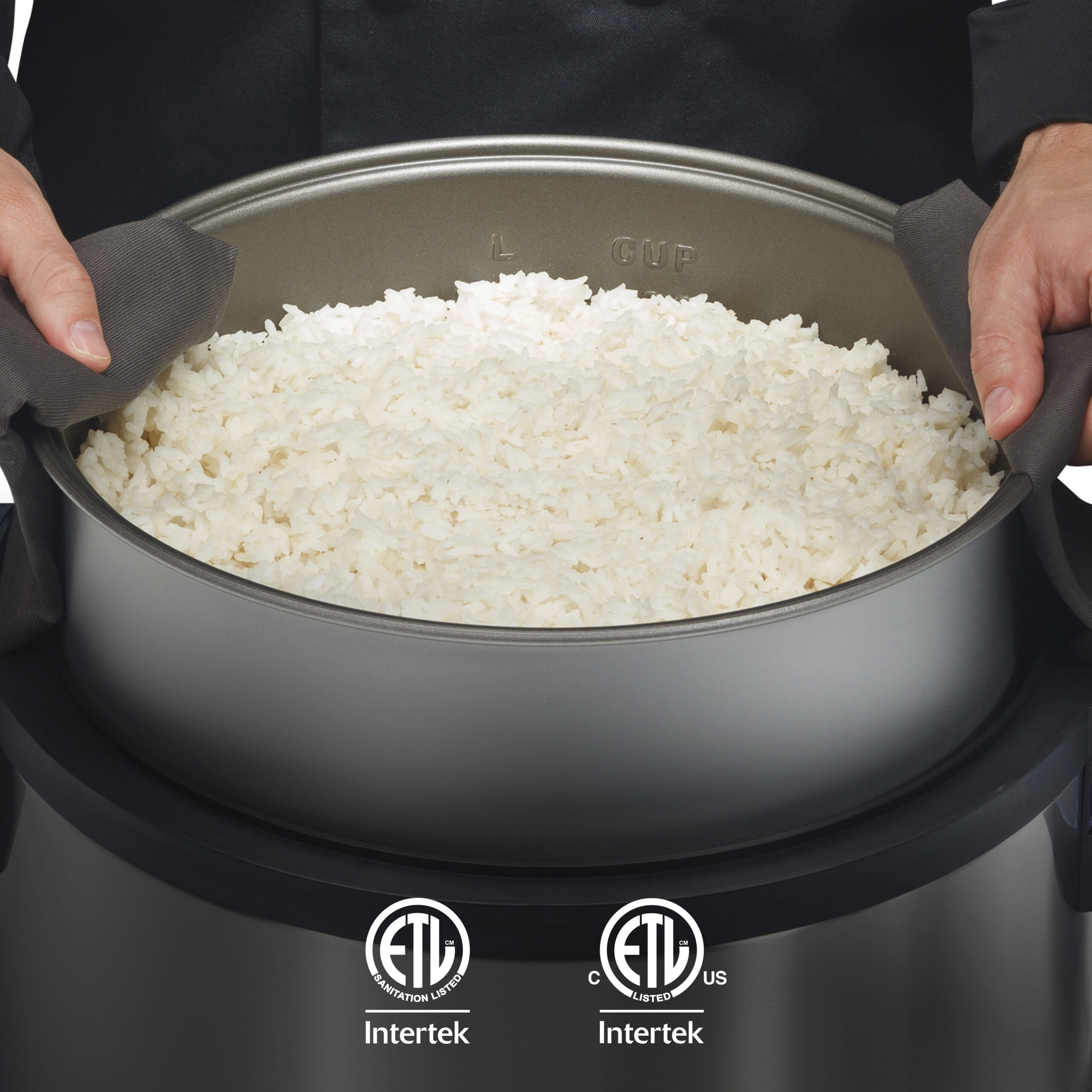 Designed for continuous commercial use, the double-wall stainless steel unit holds in heat to keep rice warm.