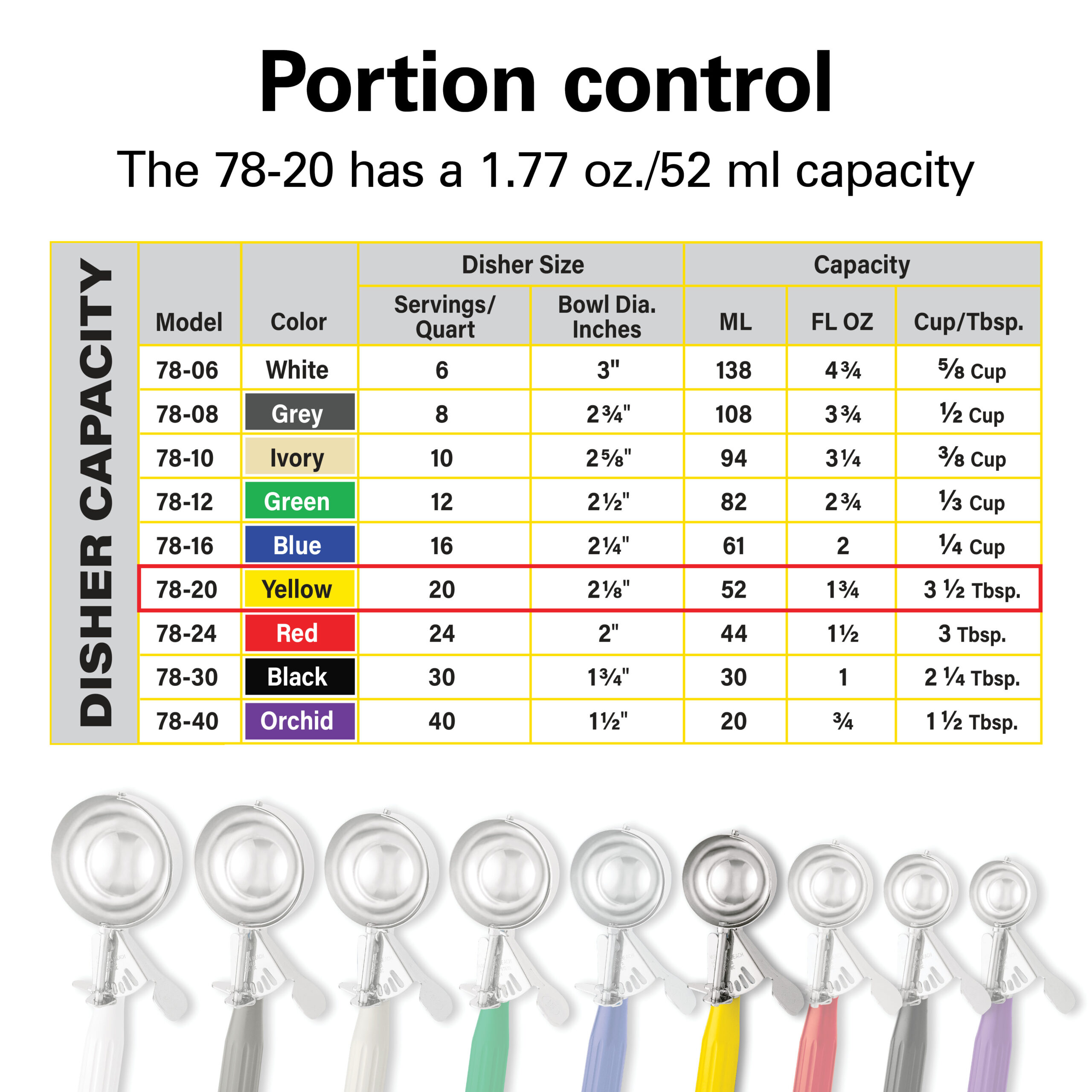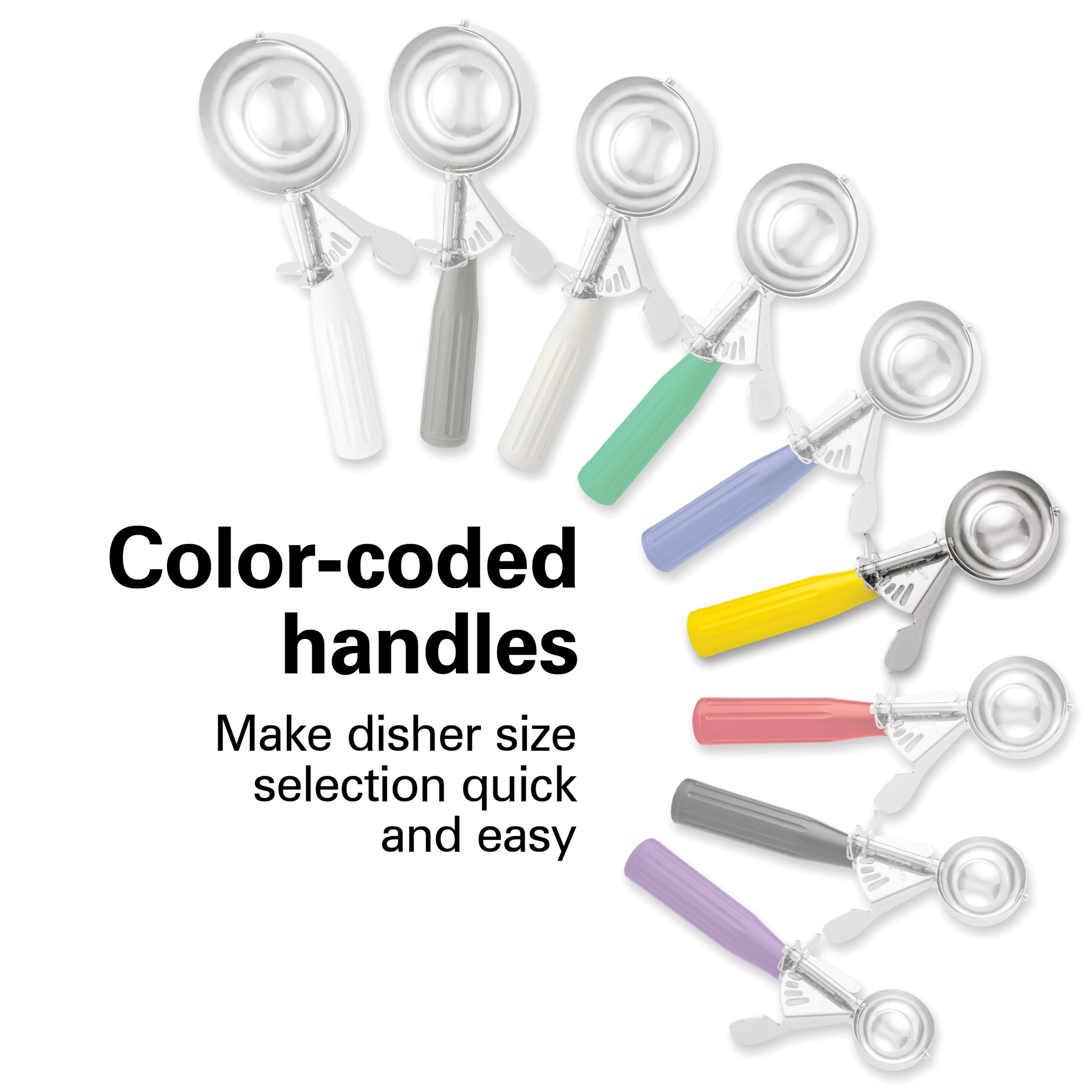 Designed for instant identification and improved service, the color-coded handles let you streamline your foodservice operation. Bright, identifiable colors help maintain portion control, and make disher size selection quick and easy.