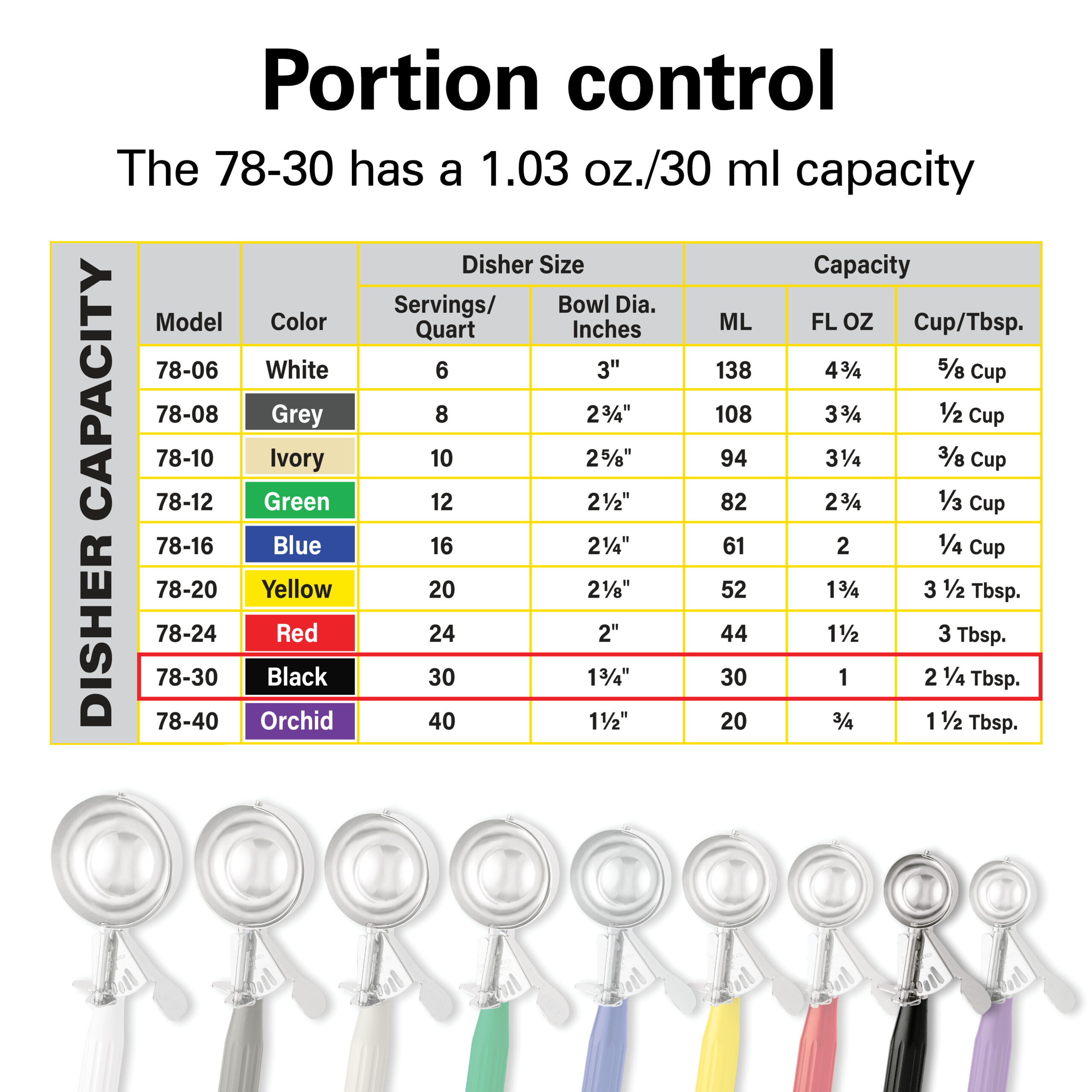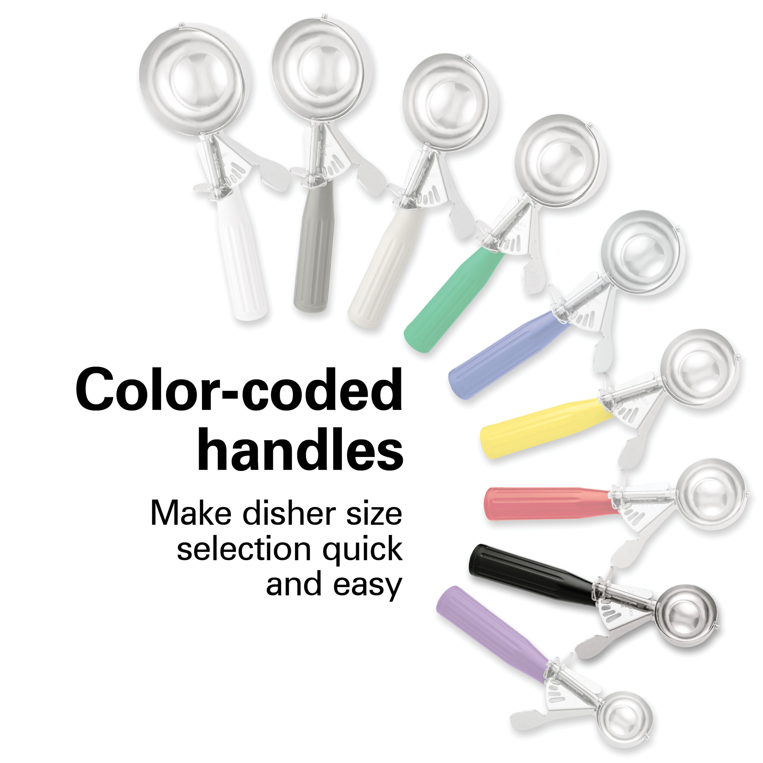 Designed for instant identification and improved service, the color-coded handles let you streamline your foodservice operation. Bright, identifiable colors help maintain portion control, and make disher size selection quick and easy.