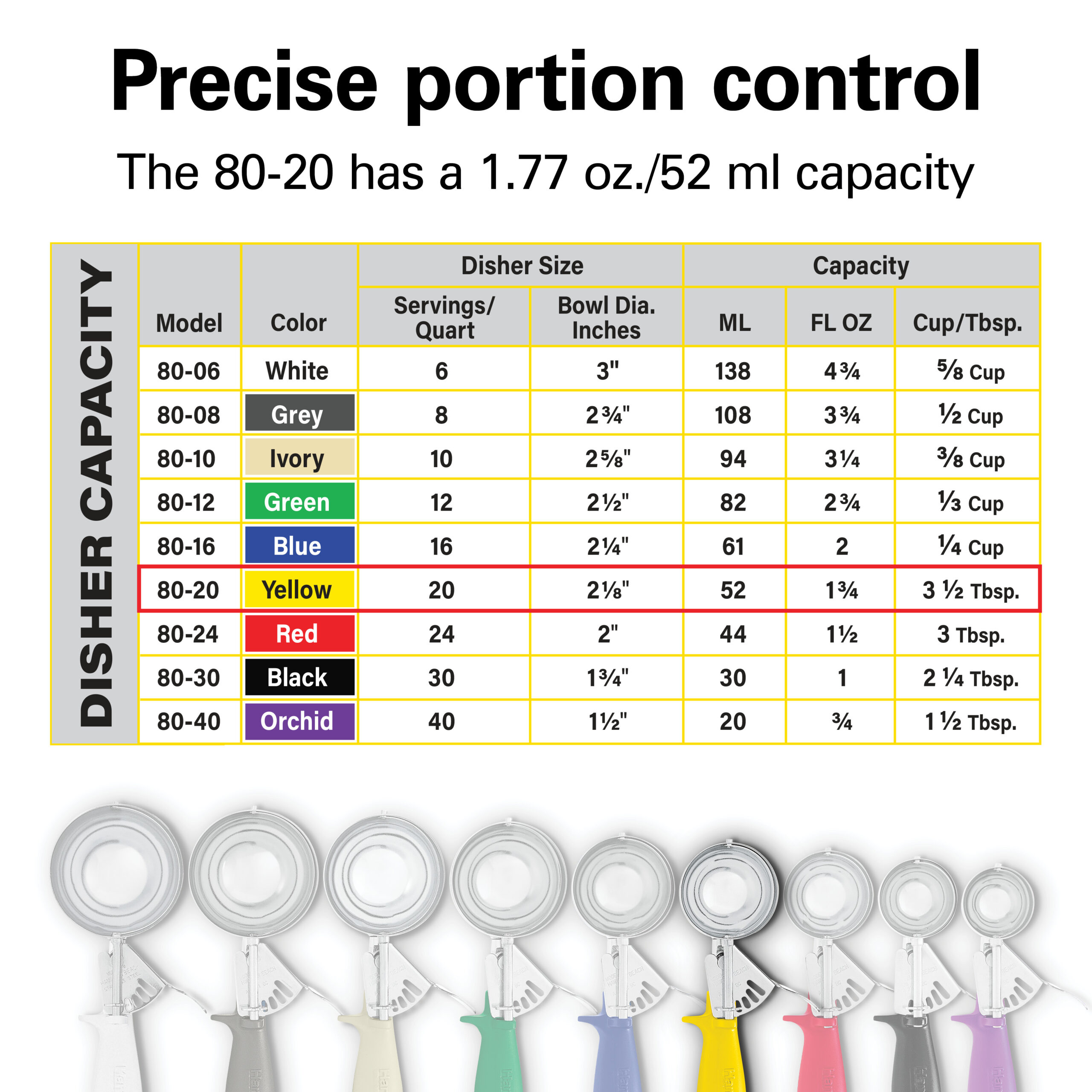 With the volume clearly molded onto each handle, there’s never a question of which size disher is being used. (80-16 shown)