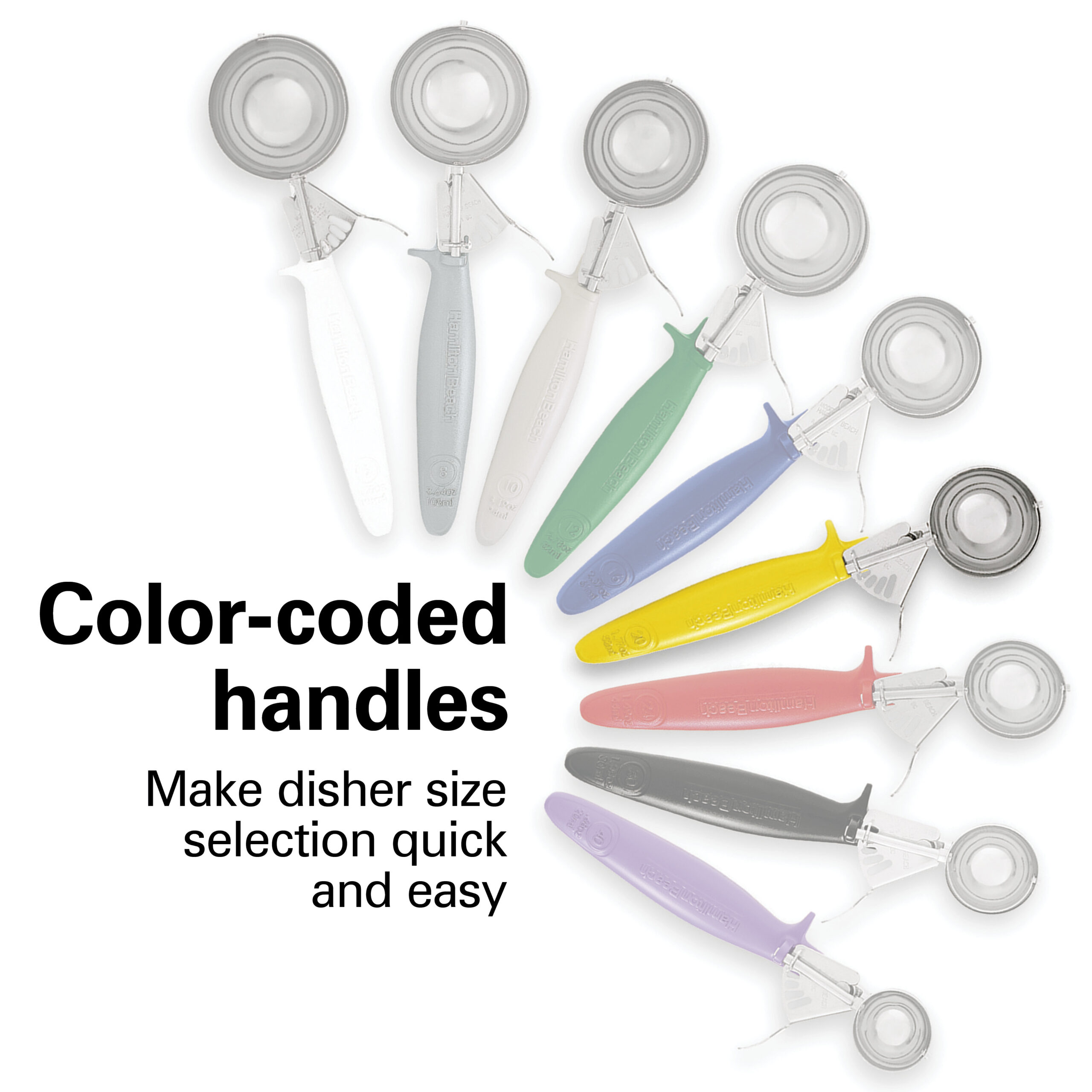 Designed for instant identification and improved service, the color-coded handles let you streamline your foodservice operation. Bright, identifiable colors help maintain portion control, and make disher size selection quick and easy.