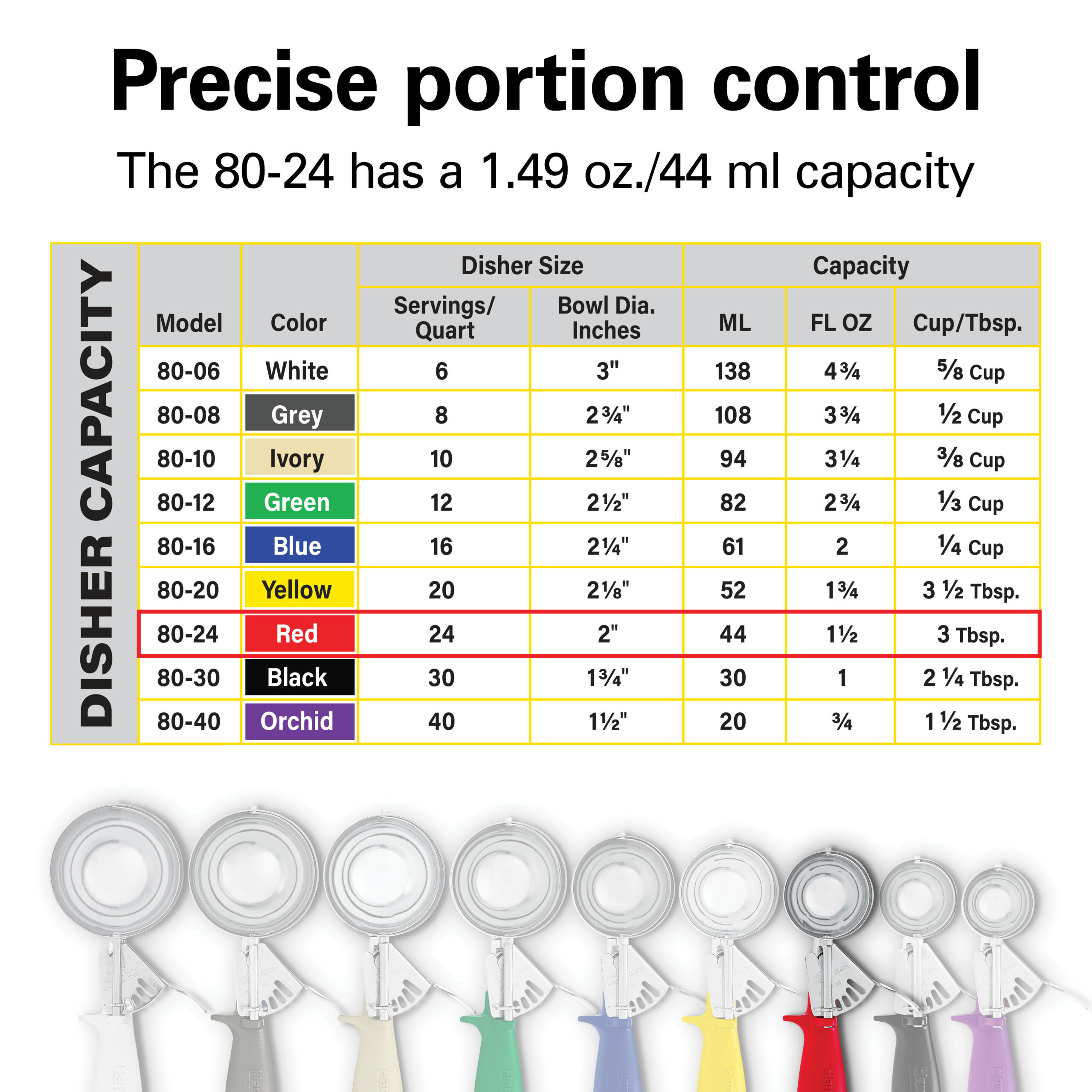With the volume clearly molded onto each handle, there’s never a question of which size disher is being used. (80-16 shown)