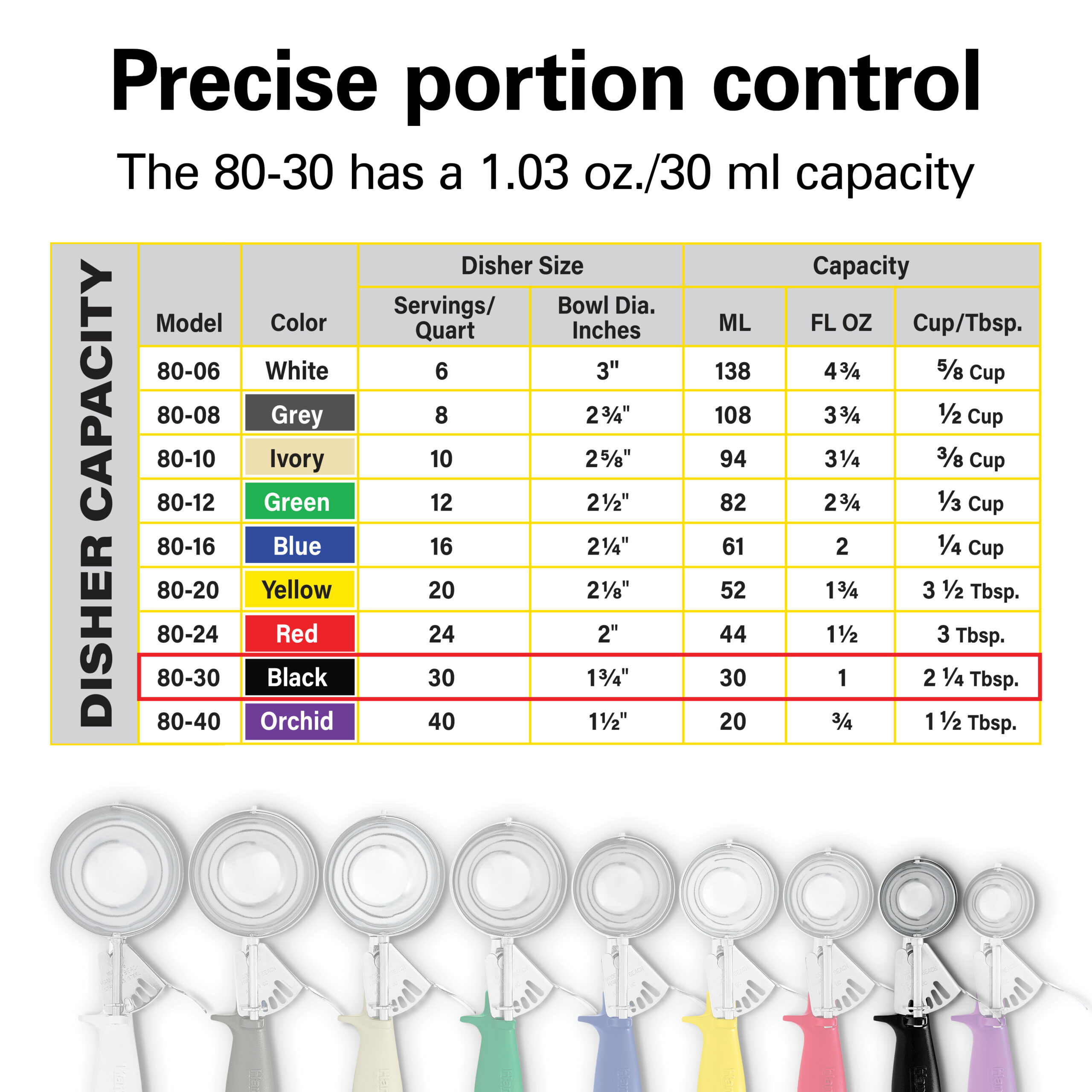 With the volume clearly molded onto each handle, there’s never a question of which size disher is being used. (80-16 shown)