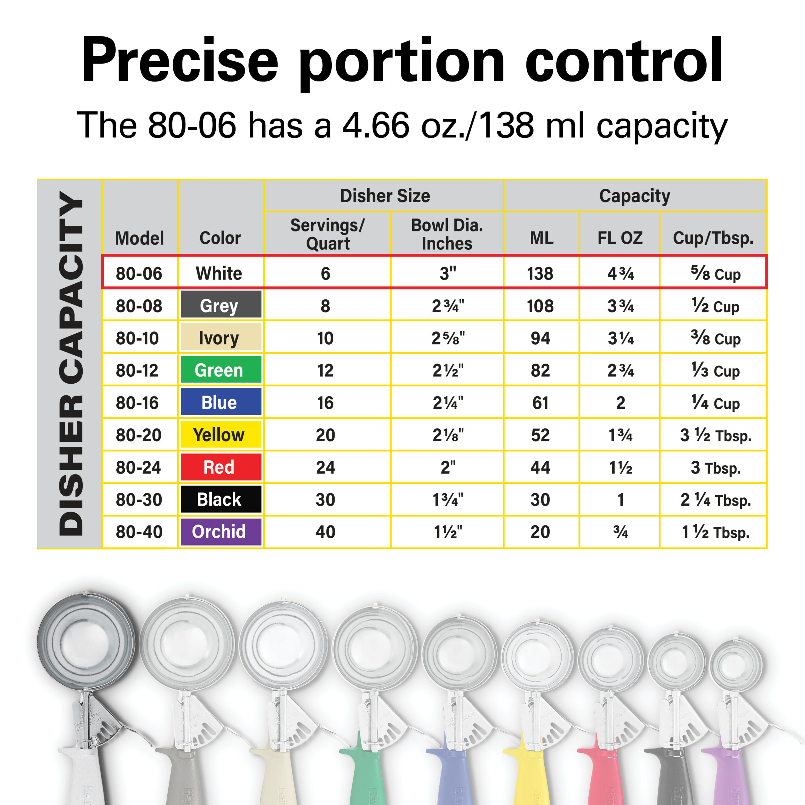 With the volume clearly molded onto each handle, there’s never a question of which size disher is being used. (80-16 shown)