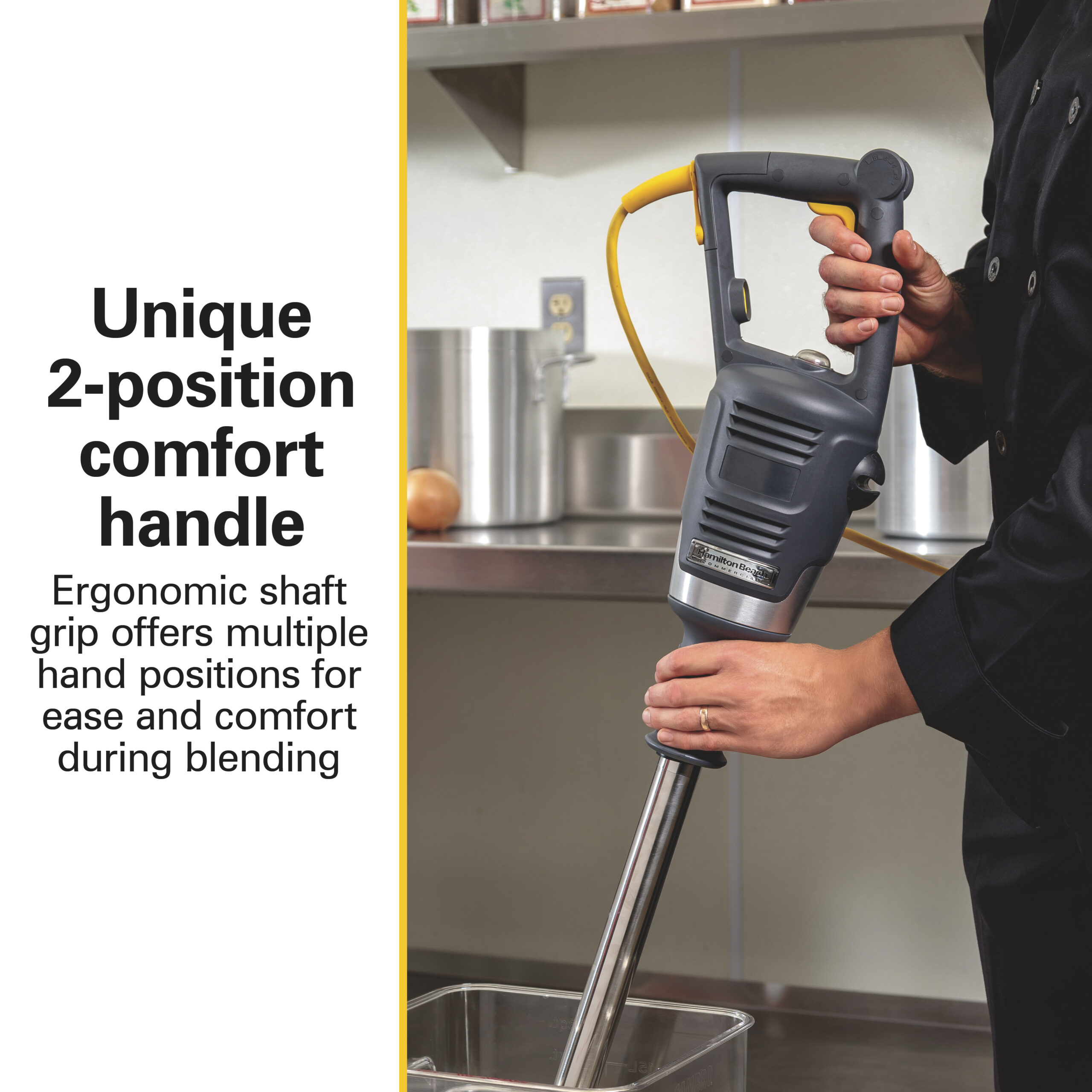An ergonomic shaft grip offers multiple hand positions for ease and comfort during blending.